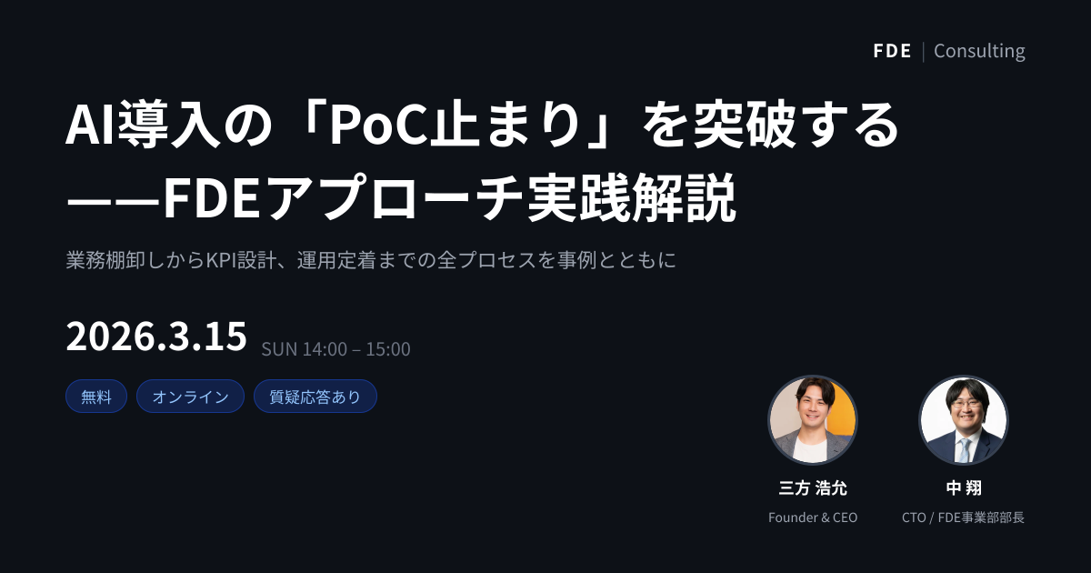 このウェビナーでは、FDE(Forward Deployed Engineer)アプローチによって AI導入の「PoC止まり」を突破し、定着率80%超を実現した実践手法を解説します。